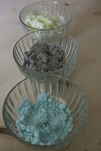 7. Берем несколько емкостей и раскладываем в каждую готовую смесь. Добавляем разные красители (добиваемся нужного цвета), эфирное масло или ароматизаторы (4-5 каплей). Теперь у нас разнообразие цвета и аромата!